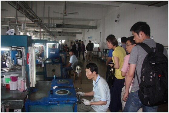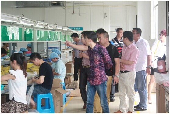 (圖為共創(chuàng)會一行參觀工廠,了解產(chǎn)品的制作流程與工藝。流水化的生產(chǎn)線,員工認真的工作態(tài)度都體現(xiàn)了晉源祥的專業(yè)性)