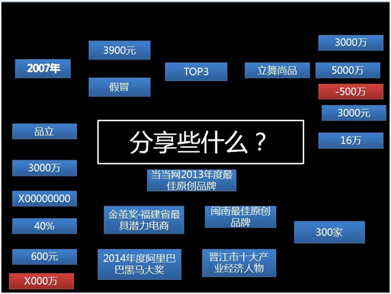 2014年度阿里巴巴黑馬獎(jiǎng)得主、晉江十大產(chǎn)業(yè)經(jīng)濟(jì)人物,最佳原創(chuàng)男裝潮品牌【品立】創(chuàng)始人,一個(gè)比女人還漂亮的男人,在分享他從傻B到騷B的磐涅過程( 創(chuàng)業(yè)7年,他用思維改變了商業(yè)模式,同時(shí)也被商業(yè)所改變。從通過線上平臺(tái)賣斷鞋賺取辛苦費(fèi),到自創(chuàng)男裝品牌,依靠打造爆款成為知名淘品牌;從慘烈競(jìng)爭(zhēng)虧損嚴(yán)重,到走調(diào)性,適時(shí)推出中高端品牌,發(fā)起新的電商突圍,并在短短半年取得了突出的成績(jī)。)!每個(gè)人成功的背后一定有他的故事,至少他的堅(jiān)韌與堅(jiān)持、頑強(qiáng)與執(zhí)著,敢想敢要敢突破就是他最好的特質(zhì)。