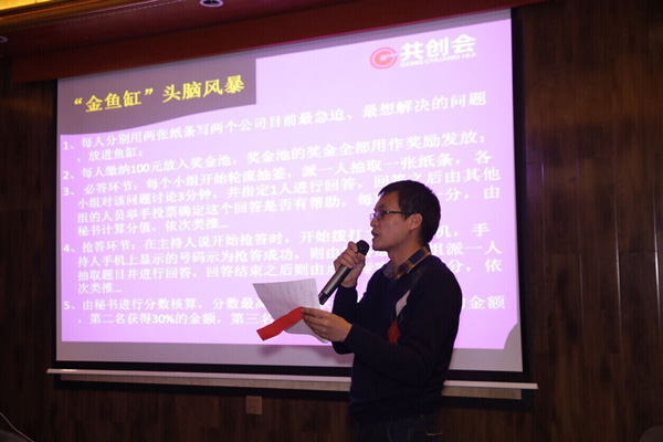 本次會議流程簡要:每人分別用兩張紙條寫兩個公司目前最急迫、最想解決 問題,放進魚缸,然后開始輪流按規(guī)則抽簽、思考、討論、解決。