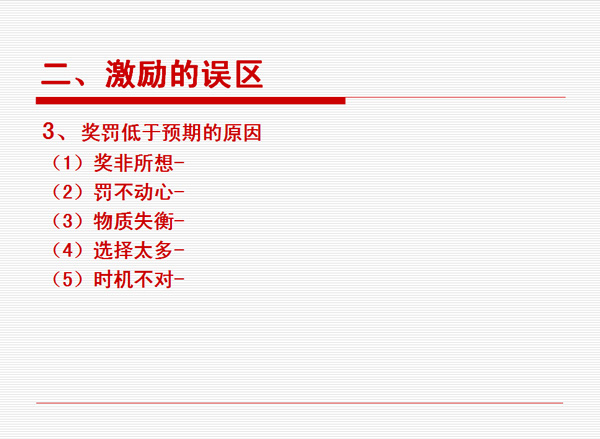 非物質(zhì)有效激勵很多人的第一反應(yīng)是不花錢,實(shí)際上世界上不花錢的東西是不存在的。而花同樣的錢辦不同的事,這是可以存在的。拿同樣的錢去產(chǎn)生不同的效益,這才是我們管理者應(yīng)該去思考的問題。